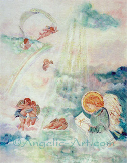 painting are cherubs watching over a small angel sleeping on a cloud with